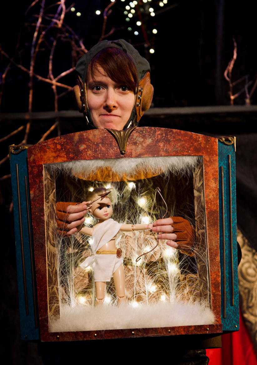 Nous nous servons également d’une marionnette manipulée par Puck dans un castelet portatif et lumineux pour illustrer le récit d’Obéron narrant la flèche de Cupidon qui rate sa cible et tombe sur une fleur désormais capable d’ensorceler n’importe quel coeur « qui tombera amoureux de la première créature qu’il verra ».
